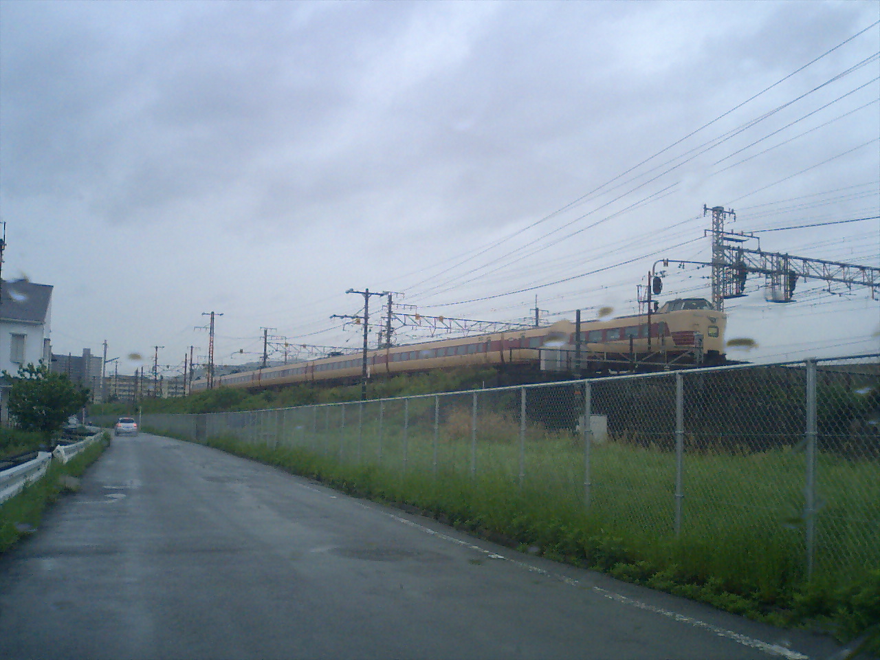 雨の中、京都総合運転所から本線へ出て行く381系特急「こうのとり」号。(営業車より)あ・・・・やっと帰れた